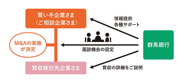 群馬銀行は、M&Aのアドバイザーとして、譲受希望企業さま(買うことを希望)・譲渡希望企業さま(売ることを希望)、それぞれに対するご支援を行い、企業マッチングを実現しています。