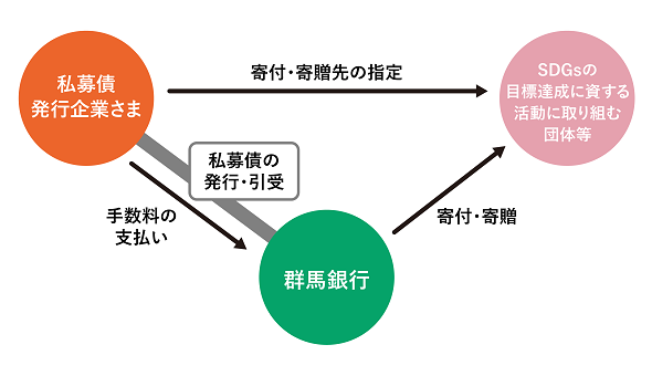群馬銀行が企業さまからいただく社債発行手数料の一部を発行企業さまの希望に合わせてSDGsの取組みを行っている団体等へ寄付・寄贈、支援、または群馬県所管の公共施設やイベント等で排出される温室効果ガスのカーボンオフセットを行う商品です。寄付・寄贈の場合、贈呈式の開催や群馬銀行のホームページでのご紹介を通じて社外PR・イメージアップにつなげています。