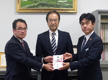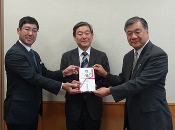 左から中村支店長、大栗校長様、持田社長様