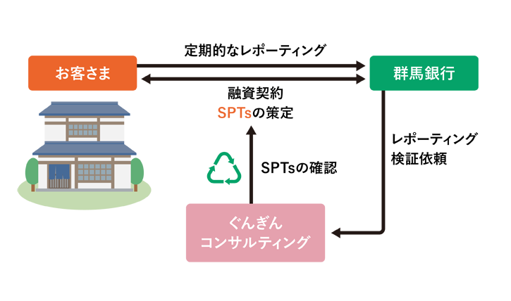 「ぐんぎんSX支援ローン」は、初めにお客さまのSDGsやESG戦略に整合した取組み目標「SPTs(サステナビリティ・パフォーマンス・ターゲット)」を設定。SPTsの達成状況に応じて、金利等の融資条件が変動する仕組みです。